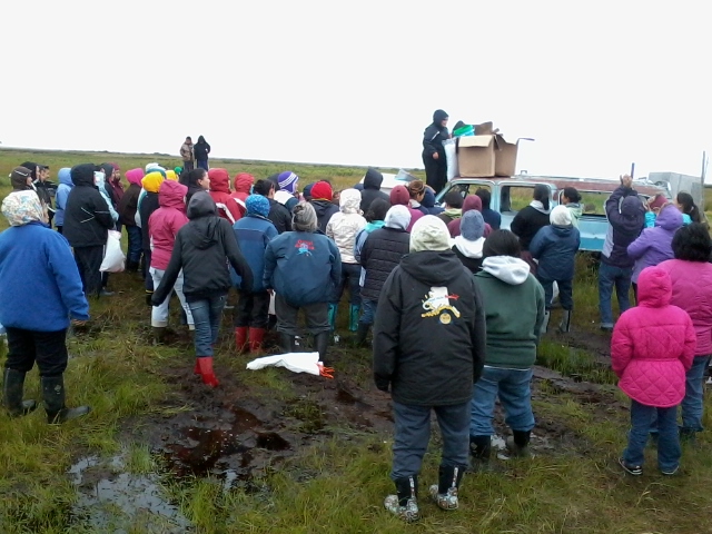 Throwing parties are similar to that of the northwest coast potlatch parties, a redistributing of goods. A celebration takes place for a variety of reasons. These can be the first year of a life, a first catch for a boy (moose/seal/caribou), or a girl's first egg from a nest she found on the tundra. A feast is held in the home where all are invited, then the women take their places outside. Everyone gets ready and the goods begin to fly.